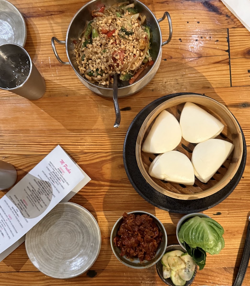 M Pocha was a fun, tasty experience. The space is quite quaint. There is a long, central, picnic style table in the middle, then the windows are lined with bar like seating, and, I believe, there is some outdoor seating. It's not too loud, but it is a cozy fit. The food was such a delight. I came with a party of 5 and tried: 1. Brussel Sprouts 2. Gai Lan (chinese broccoli) 3. Chicken Karaage 4. Spicy Por Buns 5. Nasi Goreng 6. Budae Jigae Don't sleep on the Gai Lan. All the food was scrumptious; but the Gai Lan stole the show. It had no business being that good! Tip: After you finish the broccoli, order a side of rice and mix it in with the left over sauce. It becomes a dish on its own. The service was great!