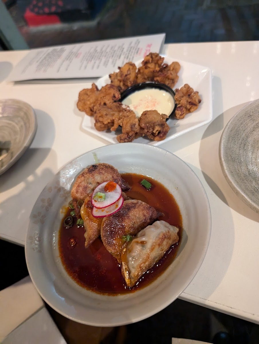 First time trying M pocha and it was pretty good! Highly recommend making a reservation bc the inside is pretty small. We came on a Tuesday night and the restaurant was full. We ordered baby octopus karaage, shrimp toast, fried kimchi onigiri, and a side of chili crisp garlic fries with kimchi aioli. We ordered the Army stew as our main. The octopus karaage was our absolute favorite and the chili crisp garlic fries were 10/10. The fries were all perfectly crispy and were so delicious with or without the kimchi aioli. The army stew was also delicious and we had leftovers. I was disappointed though that there weren't any rice cakes in mine even though it said on the menu it had it in there. Otherwise it was packed with lots of veggies, beans, and meat. Come with a side of rice, kimchi and seaweed. The only small complaint we had was the service was slow with getting the food out. They brought out each individual order of food and it took about 15-20minutes in between for each dish to come out. Otherwise the staff were great!